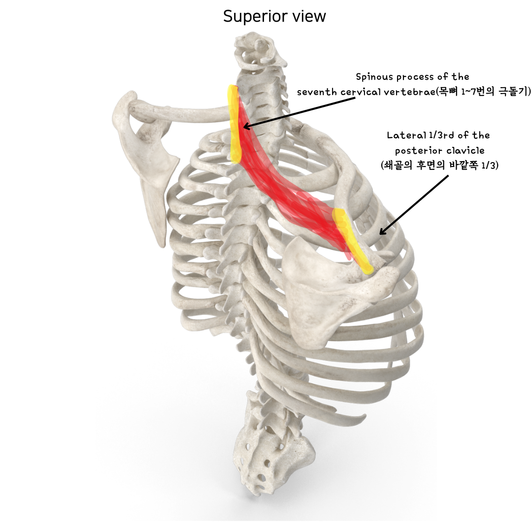 - Lateral 1/3rd of the posterior clavicle(쇄골의 후면의 바깥쪽 1/3)
