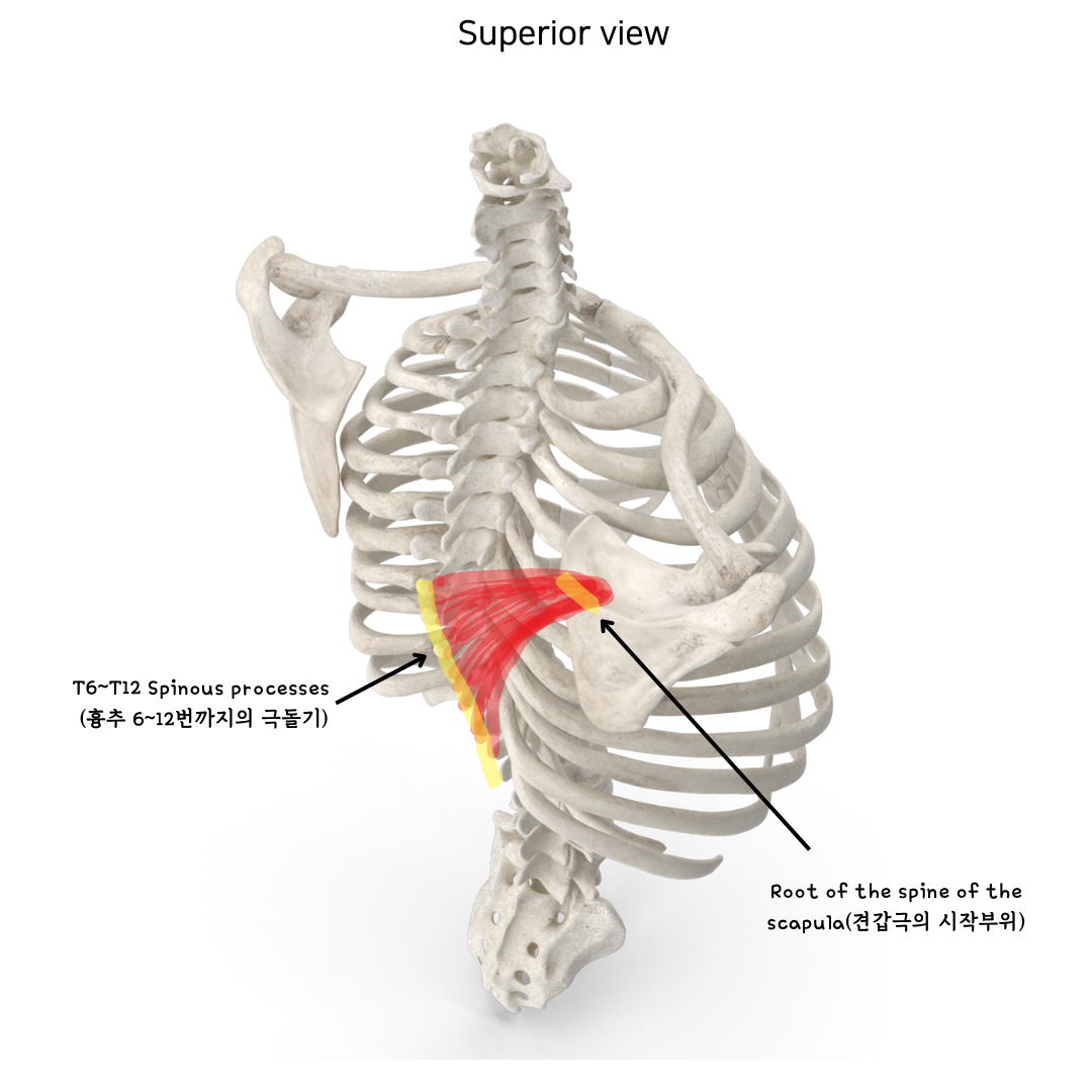 하부승모근은 위쪽 부착부위는 총 2개 부위로 시작해서