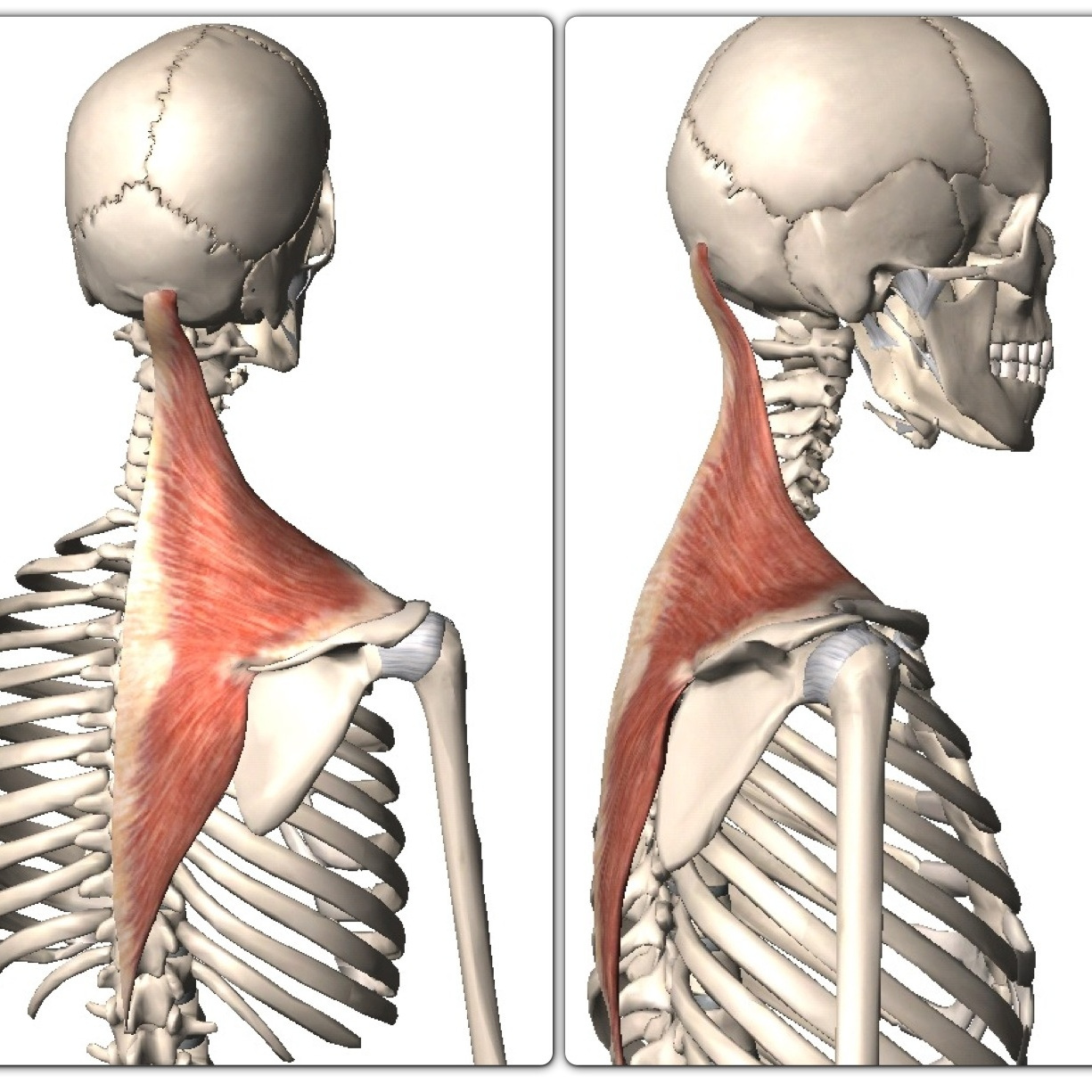 승모근은 우리 몸에서 매우 커다란 근육 중 하나로, 두개골, 견갑골, 경추, 흉추, 쇄골까지 수많은 뼈에 부착되어 여러가지 기능을 수행한다.