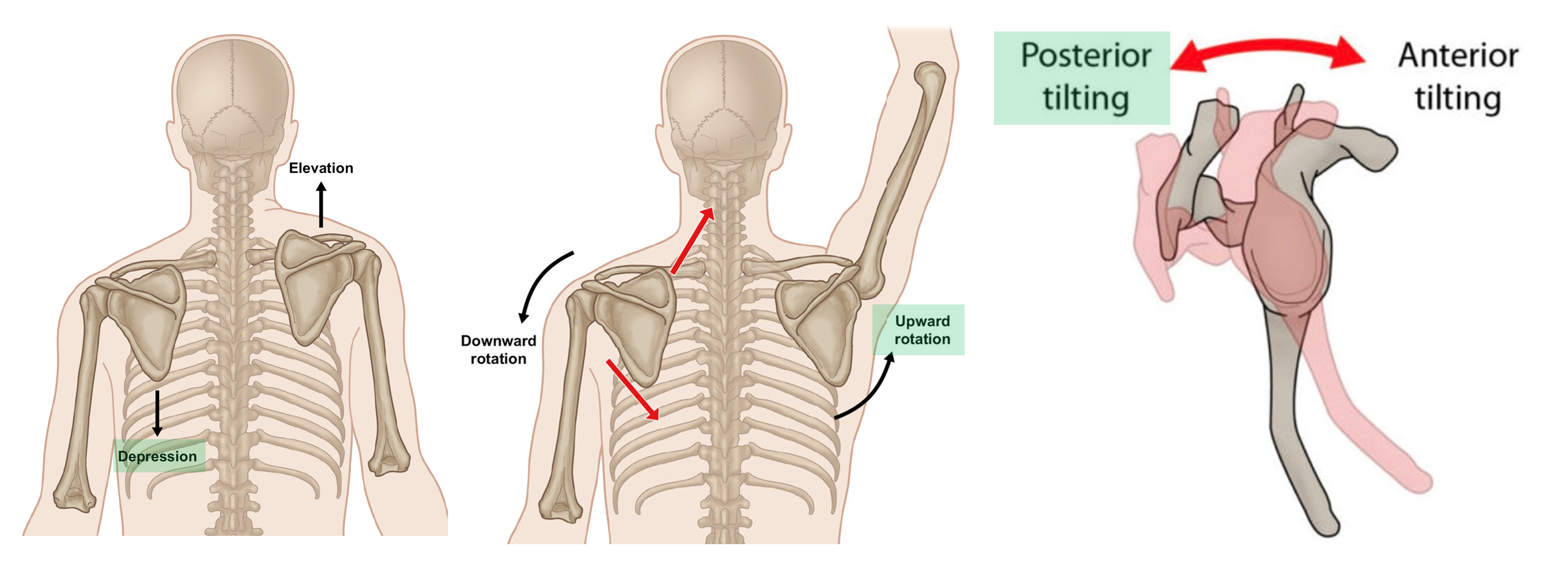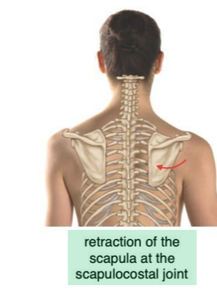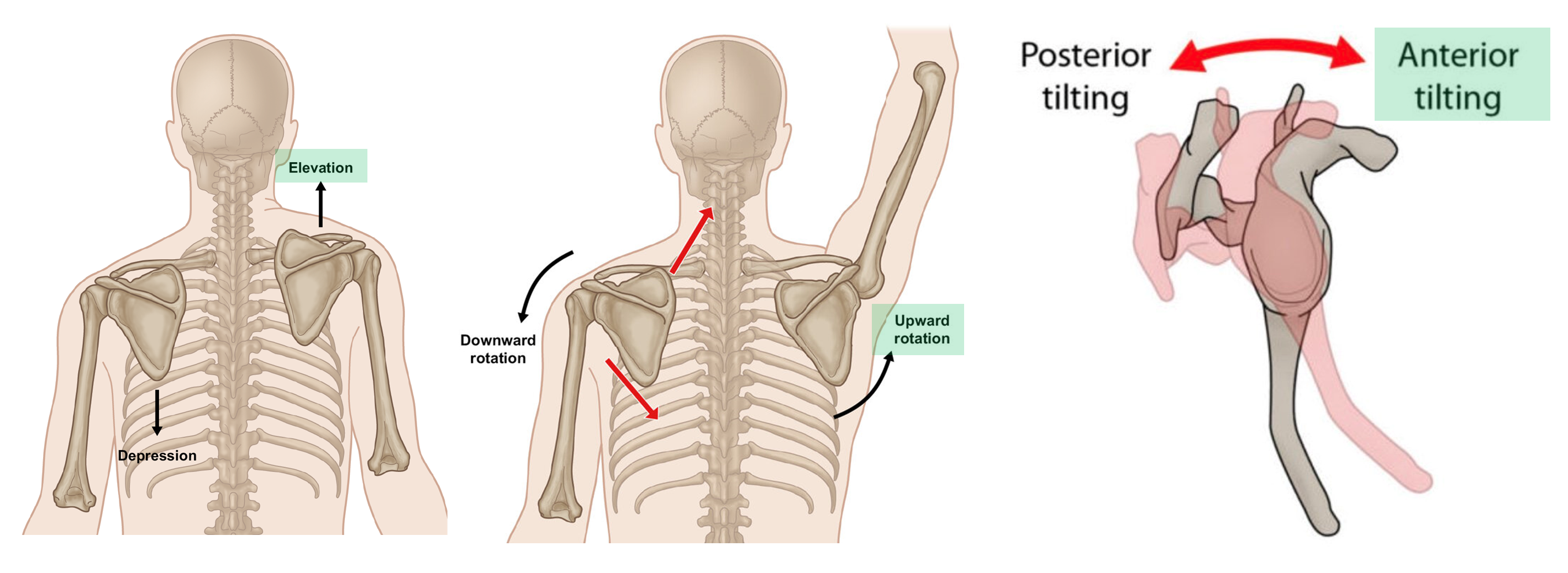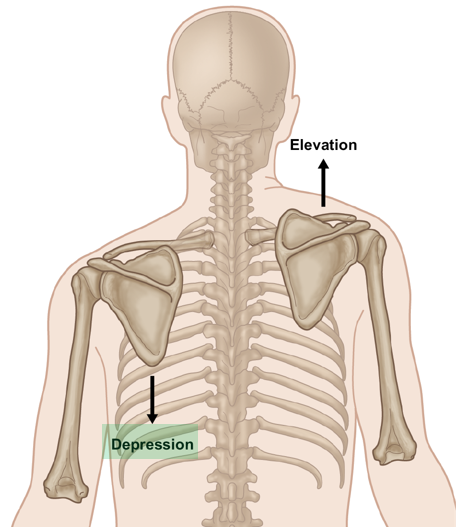 2 흉근 (Pec muscles) => 대흉근은 상완골과 쇄골을 아래로 잡아당겨 날개뼈의 하강을 유도하며, 소흉근은 오훼돌기을 아래로 잡아당겨 날개뼈의 하강을 유도한다.