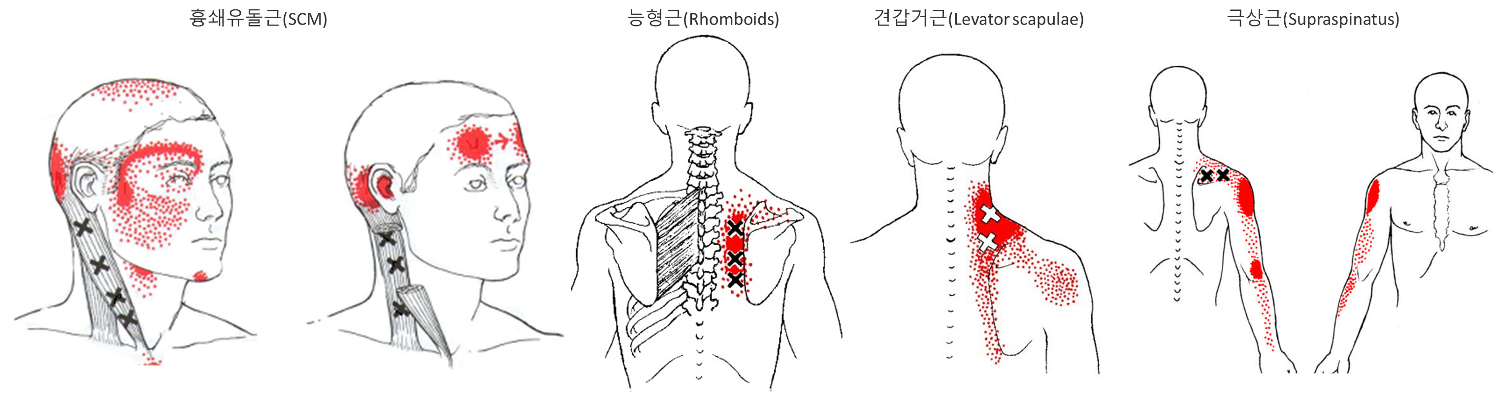 다만 승모근이 긴장되었을 때 나타나는 통증의 양상을 살펴보면 흉쇄유돌근(SCM), 능형근(Rhomboids)과 견갑거근(Levator scapulae), 극상근(Supraspinatus)의 통증 양상과 매우 유사하다.
