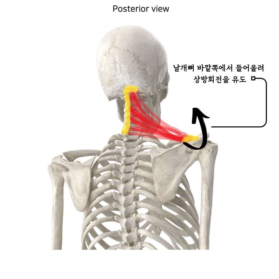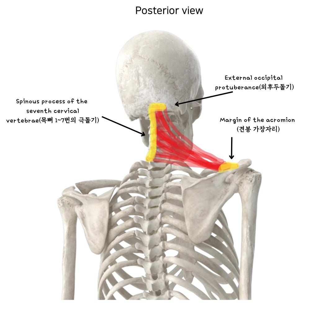 상부승모근은 External occipital protuberance(외후두돌기), Superior nuchal line(상부목덜미선의 내측부 1/3)에 부착되어 있다.