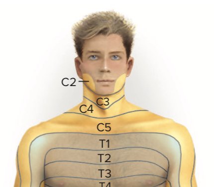 참고로 경추 3번 4번이 압박되는 경우, 오른쪽 사진처럼 해당 피부 분절에 이상감각이 나타나게 된다.