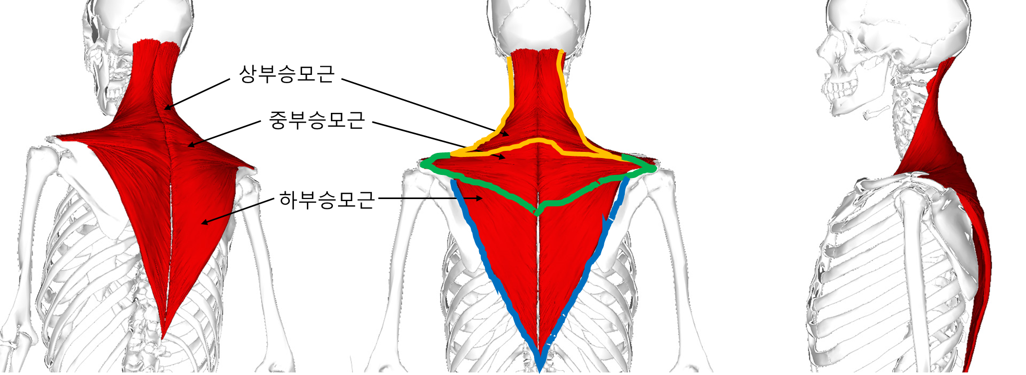승모근은 쇄골, 날개뼈, 척추뼈뿐만 아니라 두개골까지 부착되어 있기 때문에, 목 어깨 근골격계 질환에 있어서 반드시 고려해야 하는 근육이다.